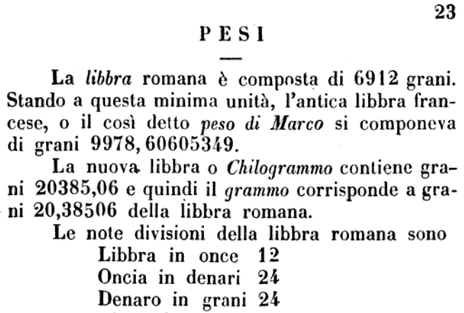 d) Unità di misura: Le antiche unità di misura italiane furono unità di misura locali in uso nel corso dei secoli nelle diverse zone del territorio italiano. Il grammo (SI) corrisponde a 20,38506 grani della libbra romana in uso nello Stato Pontificio.